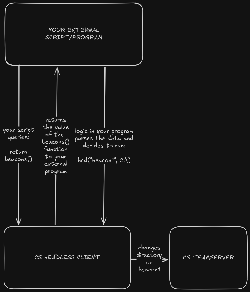 The simple solution I came up with is a very basic TCP RPC server written in sleep that can evaluate and execute aggressorscript at runtime, allowing you to build scripts in other languages that can generate and send commands to the teamserver instead of needing to write all of that logic in the script itself. I’ll provide a picture below with an example to illustrate the usecase: